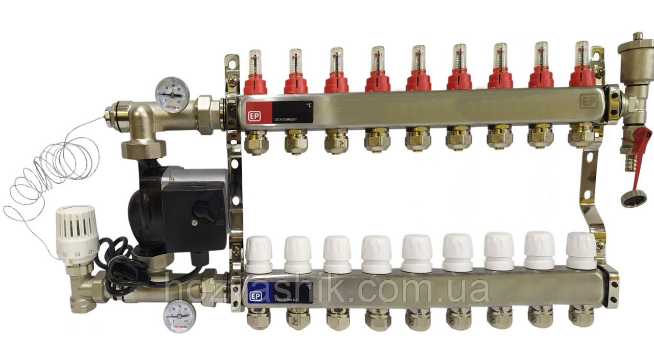 Колектор для теплої підлоги в зборі на 9 контурів з насосом, «Europroduct» НЕРЖАВІЙКА