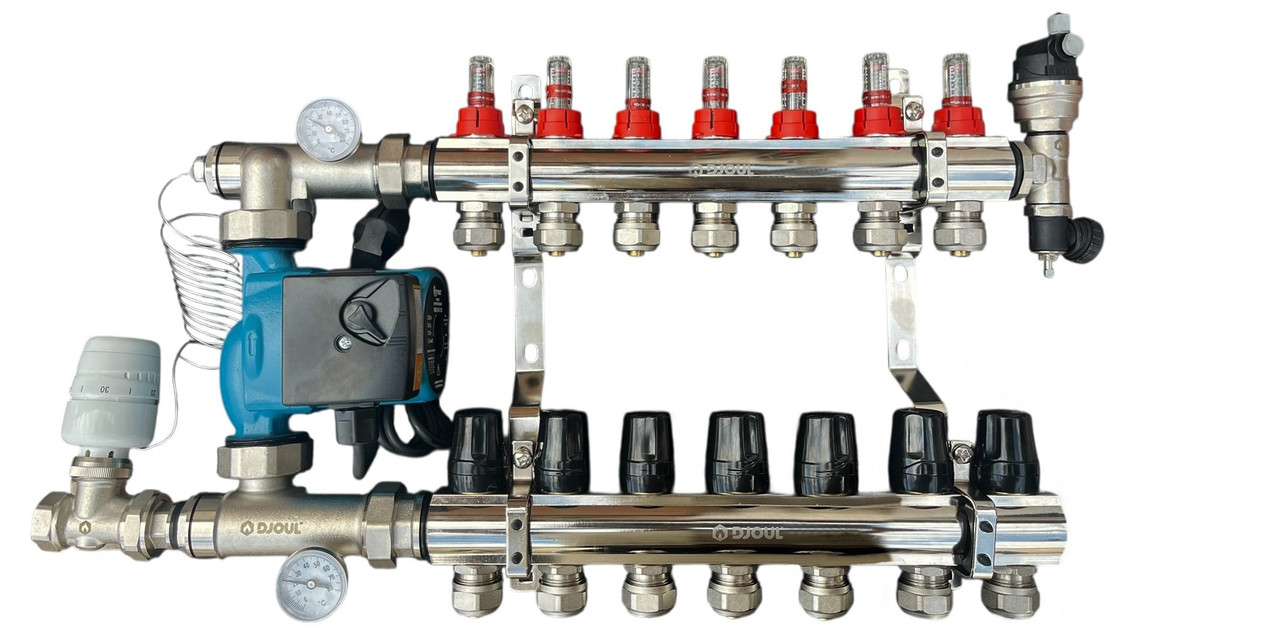 Латунний хромований колектор DJOUL на 7 контурів — надійне рішення для систем водяної теплої підлоги (ПОВНИЙ КОМПЛЕКТ).
